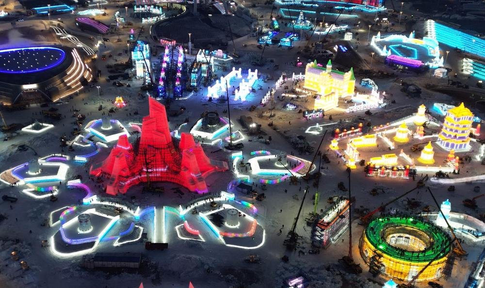 "제27회 하얼빈 빙설대세계" 건설이 막바지 단계에 접어들며 각 대형 빙설 프로젝트들이 모습을 드러내고 있다. 2025.12.12