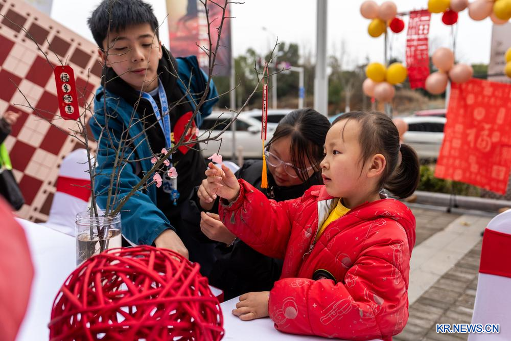 어린이들이 3일 후난(湖南)성 창사(長沙)시 왕청(望城)구 진싱베이루(金星北路) 커뮤니티에서 매화를 만들고 있다.