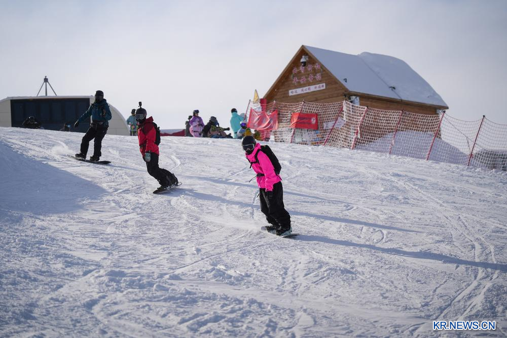 4일 신장(新疆) 아러타이(阿勒泰) 허무(禾木)촌에 위치한 지커푸린(吉克普林) 국제스키리조트에서 사진을 찍고 있는 스키 애호가들.