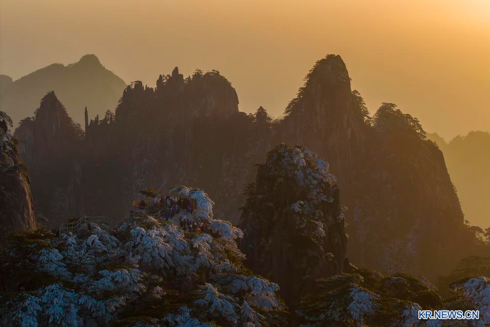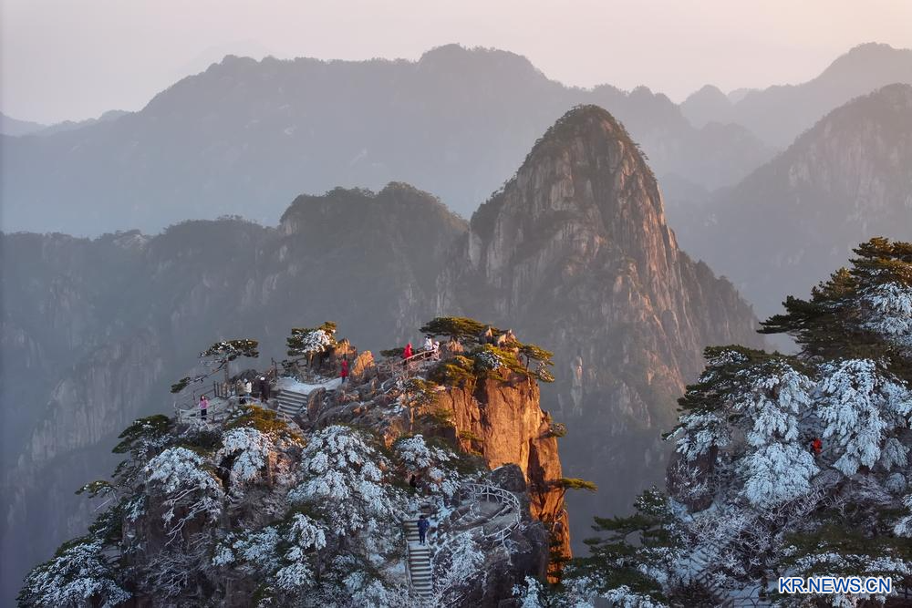 [신화망 중국 황산 2월13일] 안후이(安徽)성 황산(黃山) 풍경구에 눈이 내렸다. 이에 일출·눈·노을·운해·소나무가 한데 어우러지며 절경을 연출했다.