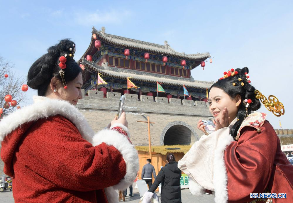 [신화망 베이징 2월18일] 17일 중국 전통 의상을 입은 관광객들이 허난(河南)성 허비(鶴壁)시 쥔(浚)현 고성에서 사진을 찍고 있다.