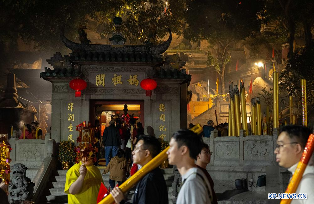 [신화망 중국 마카오 2월18일] 춘절(春節·음력설) 전날 밤 많은 마카오 주민이 아마사원(媽閣廟)에서 향을 피우고 복을 기원하며 말의 해를 즐겁게 맞이했다.