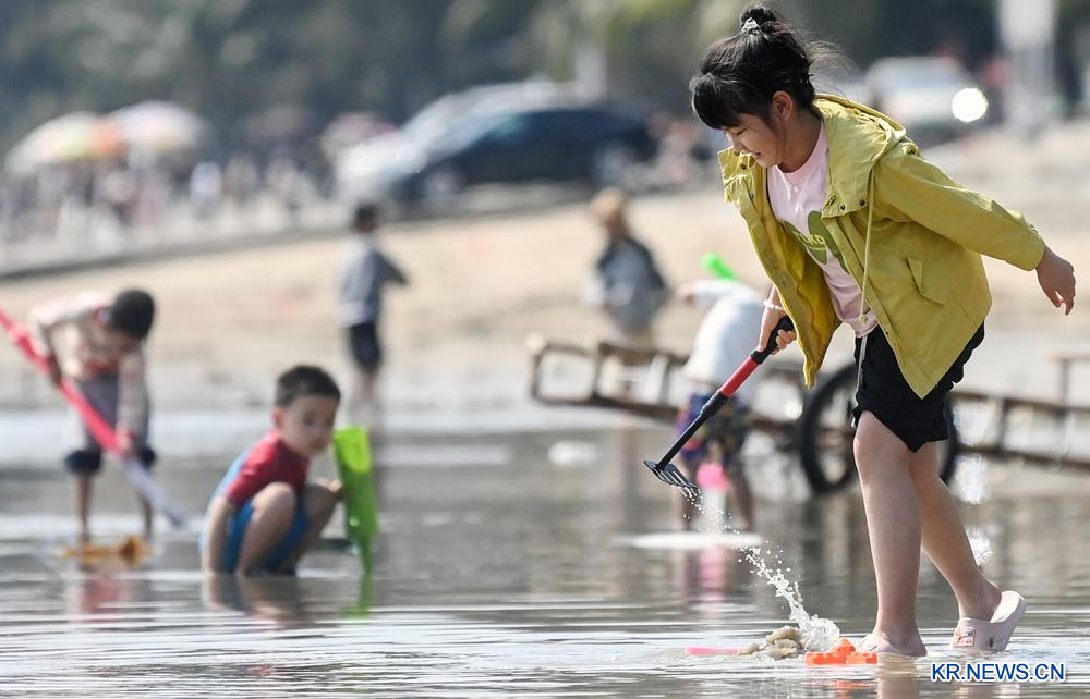 어린이가 20일 광시(廣西) 팡청강(防城港) 해변에서 모래놀이를 하고 있다.