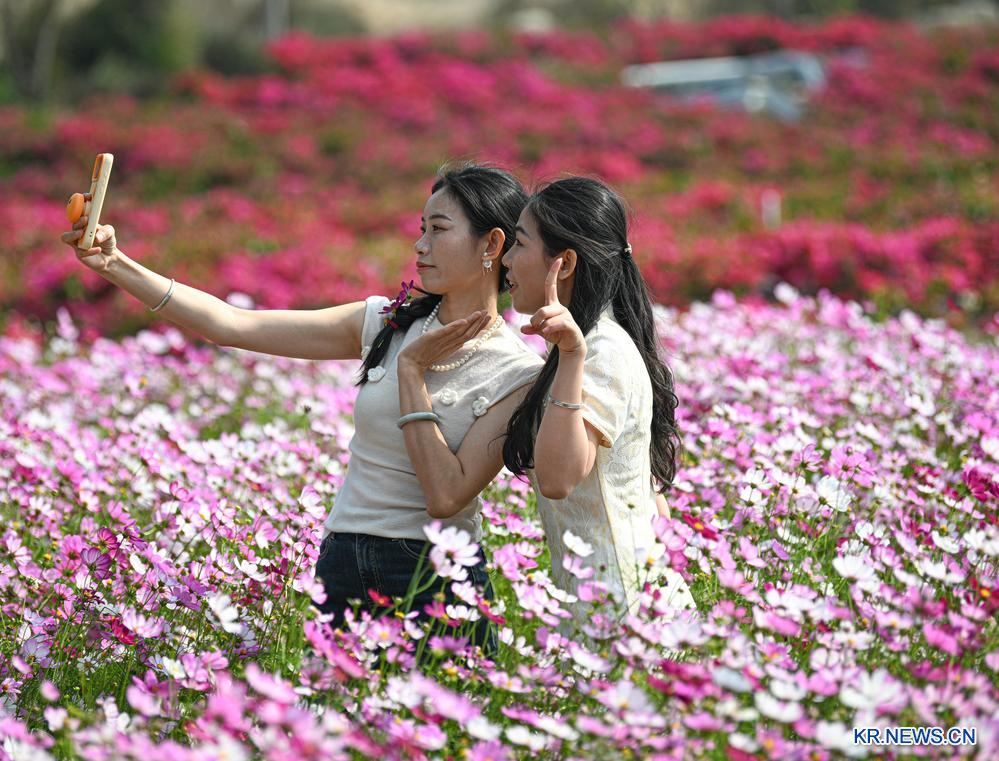 관광객이 20일 쥐위안(聚源)화훼박람원에서 코스모스를 배경으로 사진을 찍고 있다.