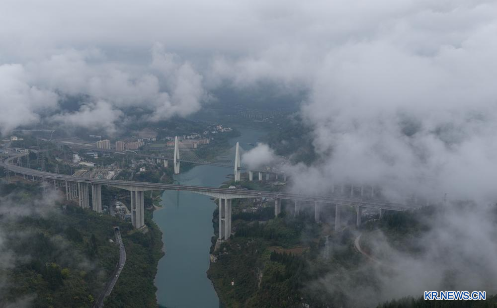 [신화망 중국 충칭 3월28일] 따뜻한 봄날 운무에 싸인 충칭(重慶)시 우룽(武隆)구가 몽환적인 분위기를 자아내고 있다.