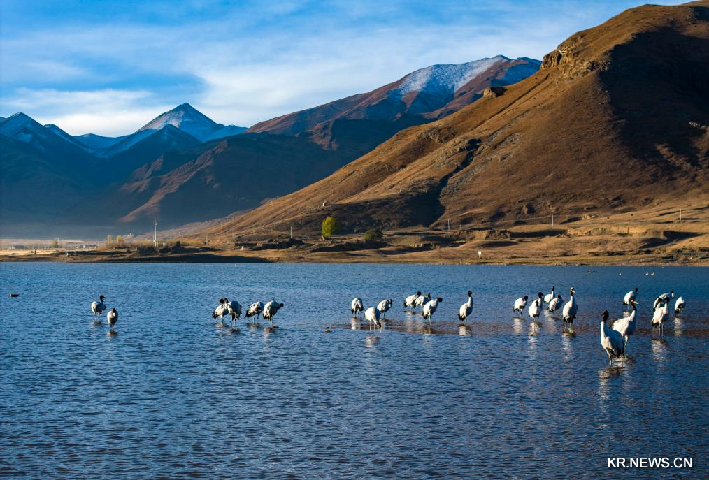 [신화망 라싸 10월26일] 검은목두루미 무리가 내년 3~4월까지 라싸(拉薩)시 린저우(林周)현 후터우산(虎頭山) 저수지에 머무른다. 평균 해발고도 약 4천200m에 위치한 린저우현은 검은목두루미의 주요 서식지이다.