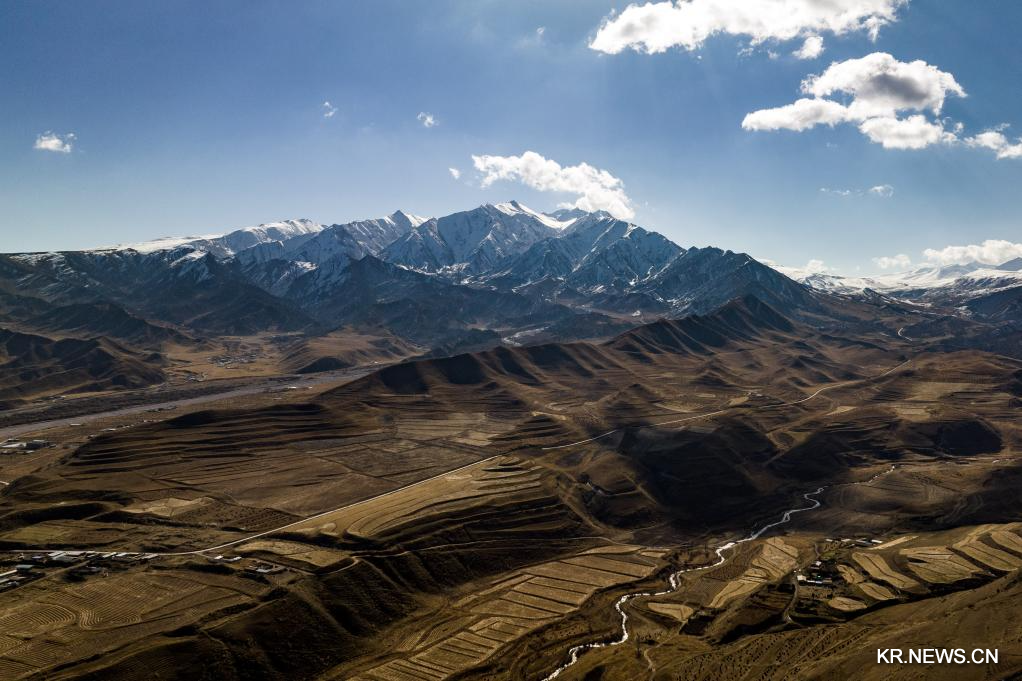 [신화망 시닝 10월28일] 칭하이(靑海)성 하이난(海南)짱(藏)족자치주 구이더(貴德)현 역내에 가을 풍경을 27일 드론 사진에 담았다.
