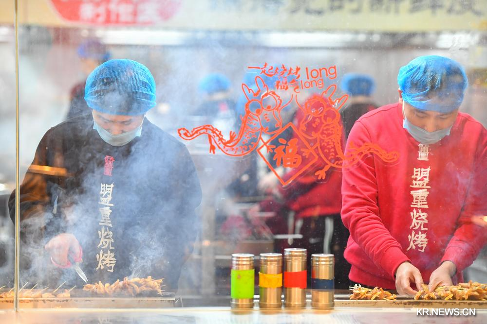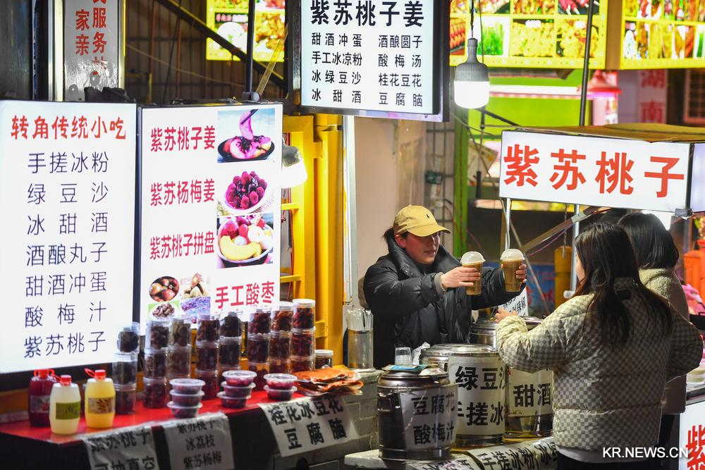[신화망 창사 2월6일] 춘절(春節·음력설)이 가까워지자 후난(湖南)성 창사(長沙)시 톈신(天心)구에 위치한 둥과산(東瓜山) 야시장 먹자골목이 사람들로 북적이기 시작했다. 이곳의 30여 개 가게는 연휴 기간 밀려들 손님을 맞이하기 위한 준비에 여념이 없다.