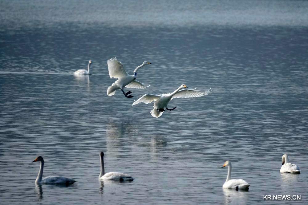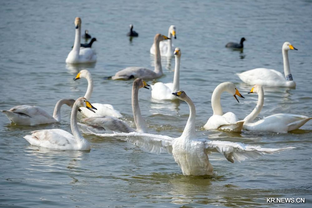 [신화망 핑루 3월16일] 해마다 겨울이 되면 수많은 백조가 겨울을 나기 위해 시베리아에서 산시(山西)성 핑루(平陸)현 황허(黃河)습지로 모여든다. 백조는 이듬해 3월 월동을 마치고 떼를 지어 다시 시베리아로 이동한다.
