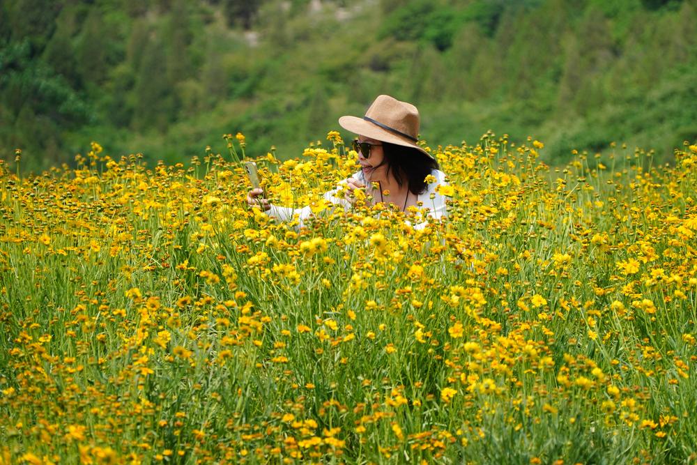 [신화망 지난 5월23일] 산둥(山東)성 지난(濟南)시 얼환둥루(二環東路)에서 한 시민이 22일 활짝 핀 금계국을 배경으로 기념사진을 찍고 있다.