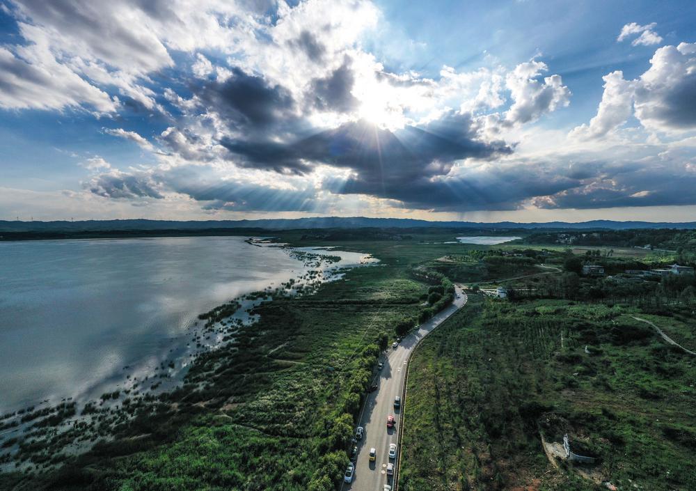 [신화망 웨이닝 8월3일] 1일 구이저우(貴州)성 웨이닝(威寧)현 차오하이(草海) 관광지 해안도로를 드라이브하는 관광객 차량을 드론 사진에 담았다.