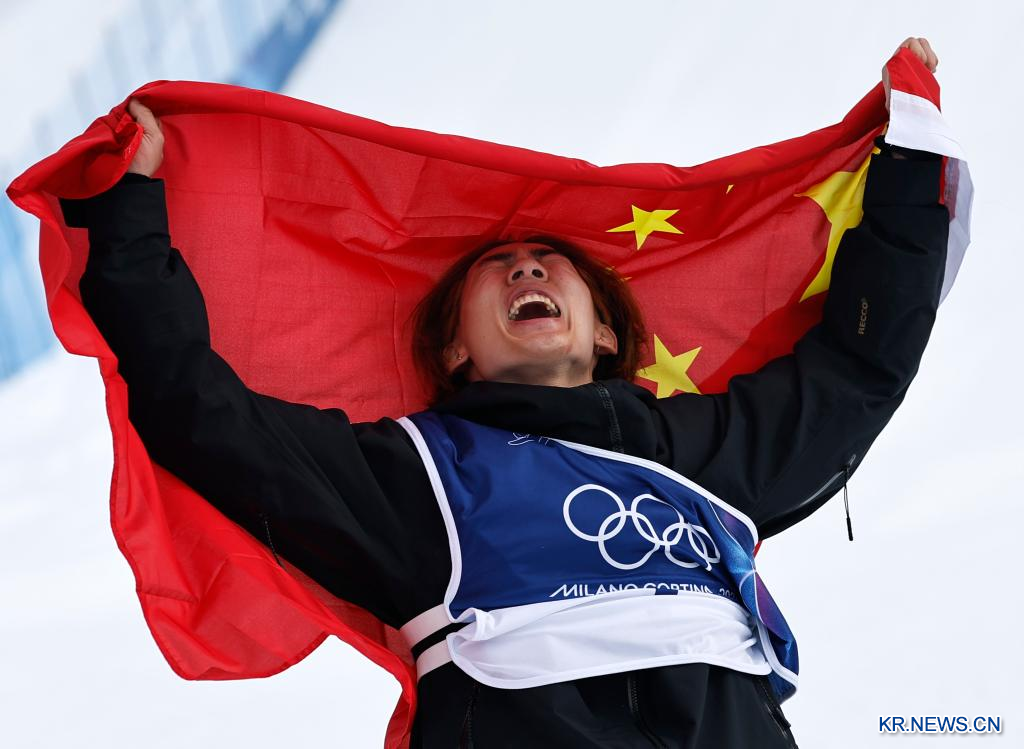 [신화망 이탈리아 리비뇨 2월19일] 중국의 쑤이밍 선수가 18일(현지시간) 이탈리아 리비뇨에서 열린 밀라노-코르티나 동계 올림픽 스노보드 남자 슬로프스타일 결승에서 금메달을 획득했다.[촬영/신화통신 기자 왕펑(王鹏)]