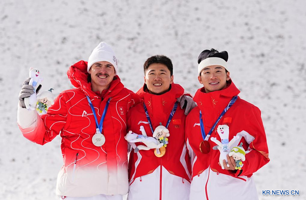 중국의 왕신디(王心迪) 선수와 리톈마(李天馬)선수가 20일(현지시간) 이탈리아 리비뇨에서 열린 밀라노-코르티나 동계 올림픽 프리스타일 스키 남자 에어리얼 결승에서 각각 금메달과 동메달을 목에 걸었다. [촬영/신화통신 기자 우후이워(邬惠我)]