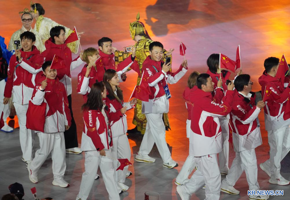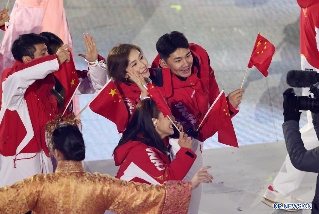 22일(현지시간) 열린 폐막식에서 중국 선수단 기수 쑤이밍((蘇翊鳴)이 입장하고 있다.
