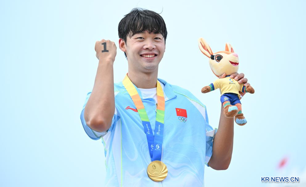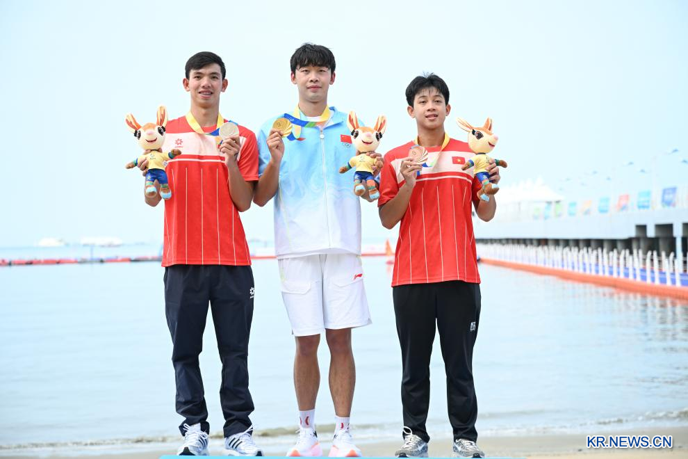 장쯔양(張子揚∙중국)이 26일 하이난(海南)성 싼야(三亞)에서 열린 제6회 아시안비치게임(ABG) 오픈워터스위밍(Open water swimming) 남자 5km 경기에서 금메달을 땄다. 은메달과 동메달은 베트남이 차지했다.[촬영/신화통신 기자 베이허(貝赫)]