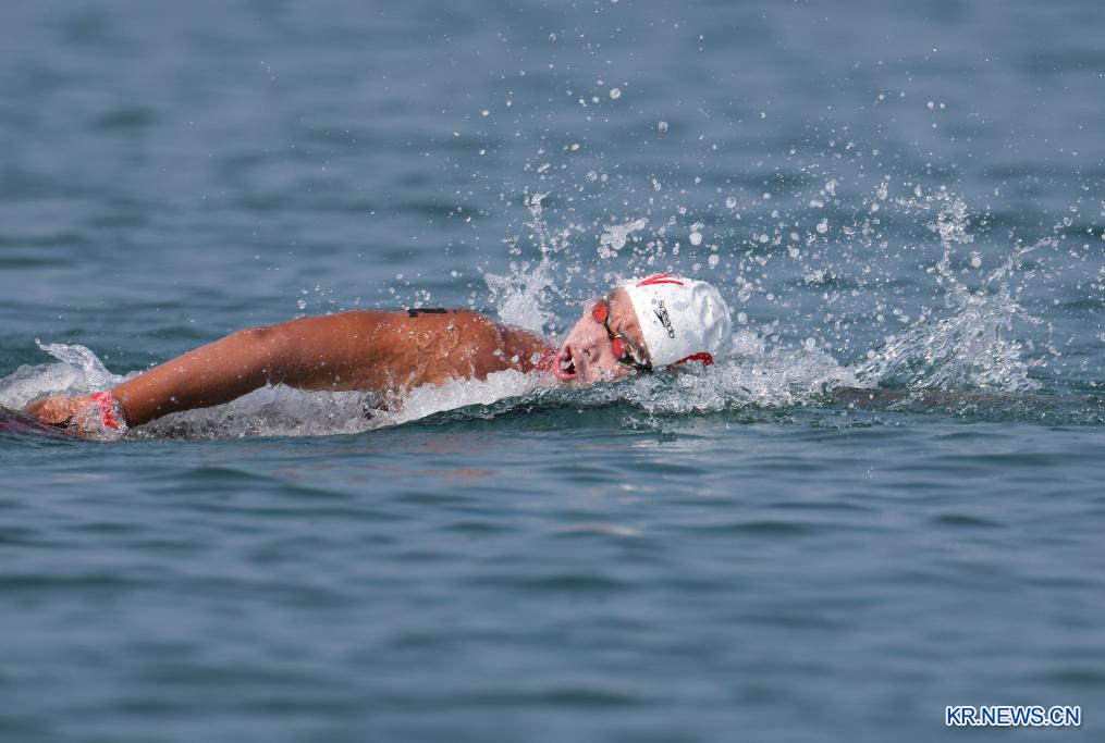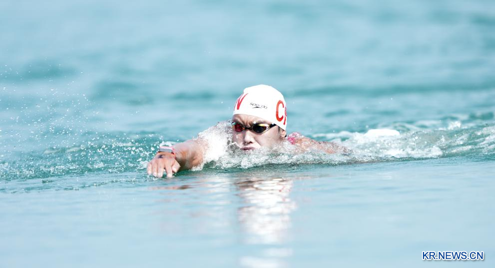 장쯔양(張子揚∙중국)이 26일 하이난(海南)성 싼야(三亞)에서 열린 제6회 아시안비치게임(ABG) 오픈워터스위밍(Open water swimming) 남자 5km 경기에서 금메달을 땄다. 은메달과 동메달은 베트남이 차지했다.[촬영/마쯔한(馬子涵)]