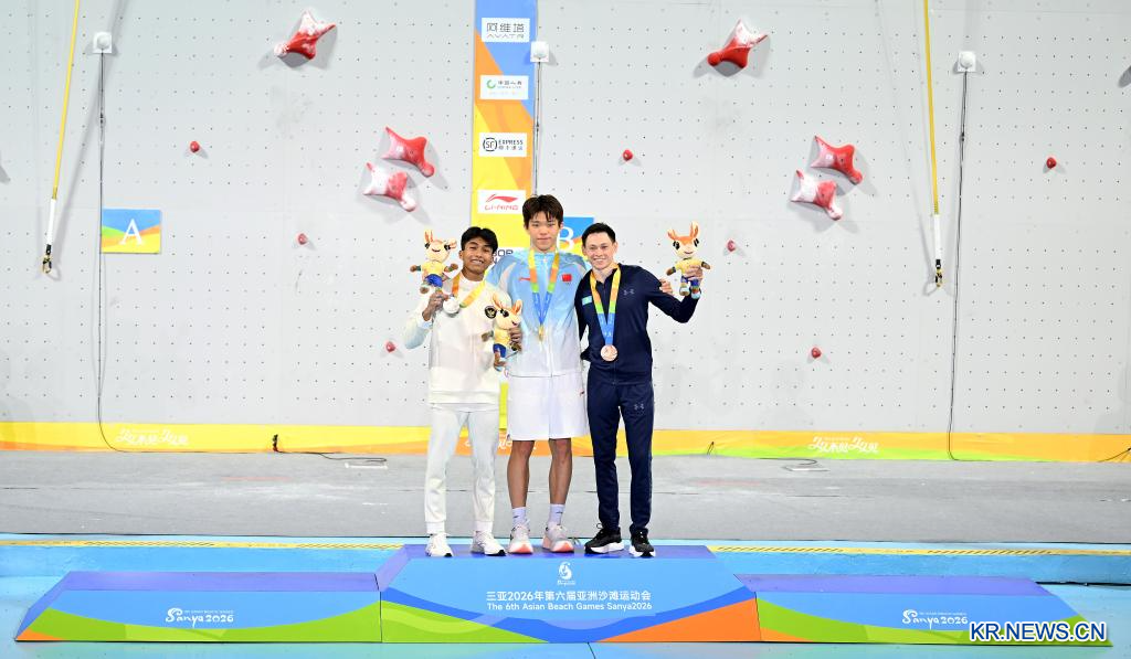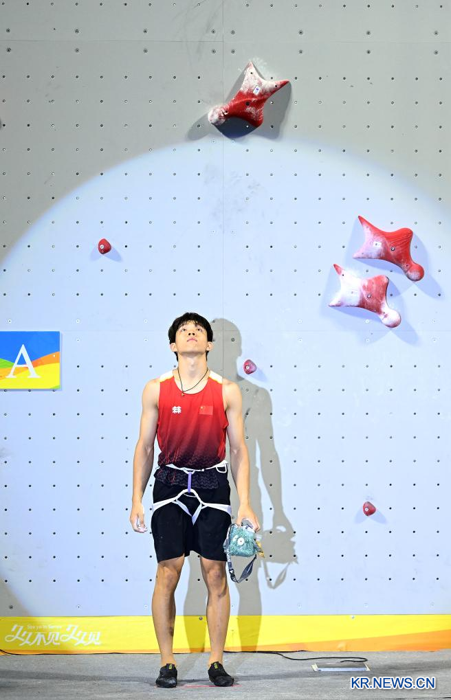 28일 중국 하이난성 싼야에서 열린 제6회 싼야 아시안 비치 게임 스포츠클라이밍 남자 스피드 결승전에서 중국 선수 자오이청이 인도네시아 선수를 꺾고 우승을 거머쥐었다.[촬영/신화통신 기자 자오쯔숴(趙子碩)]