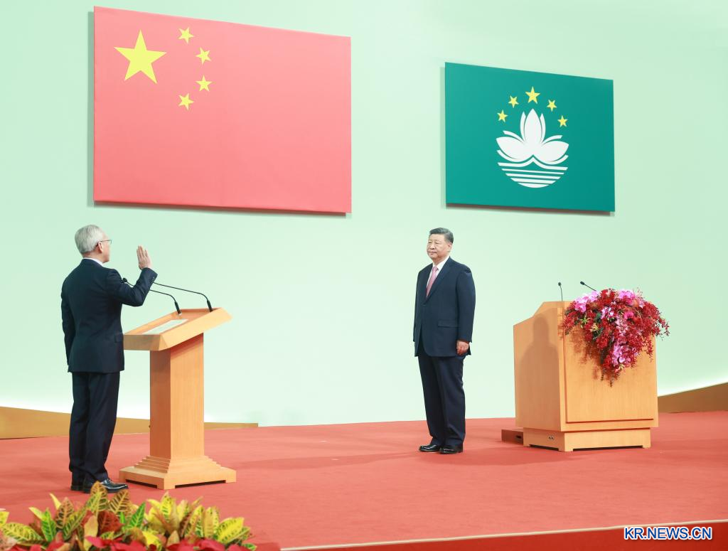 [신화망 마카오 12월20일] "마카오 조국 반환 25주년 경축 대회 및 마카오 특별행정구(특구) 제6차 정부 취임식"이 20일 마카오 동아시안게임 돔에서 성황리에 열렸다. 시진핑(習近平) 중국 공산당 중앙위원회 총서기, 국가주석, 중앙군사위원회 주석이 참석해 중요 연설을 했다. 시 주석은 삼호우파이(岑浩輝) 제6대 마카오특별행정구 행정장관의 취임 선서를 받고 있다.[촬영/신화사 기자 쥐펑(鞠鹏)]
