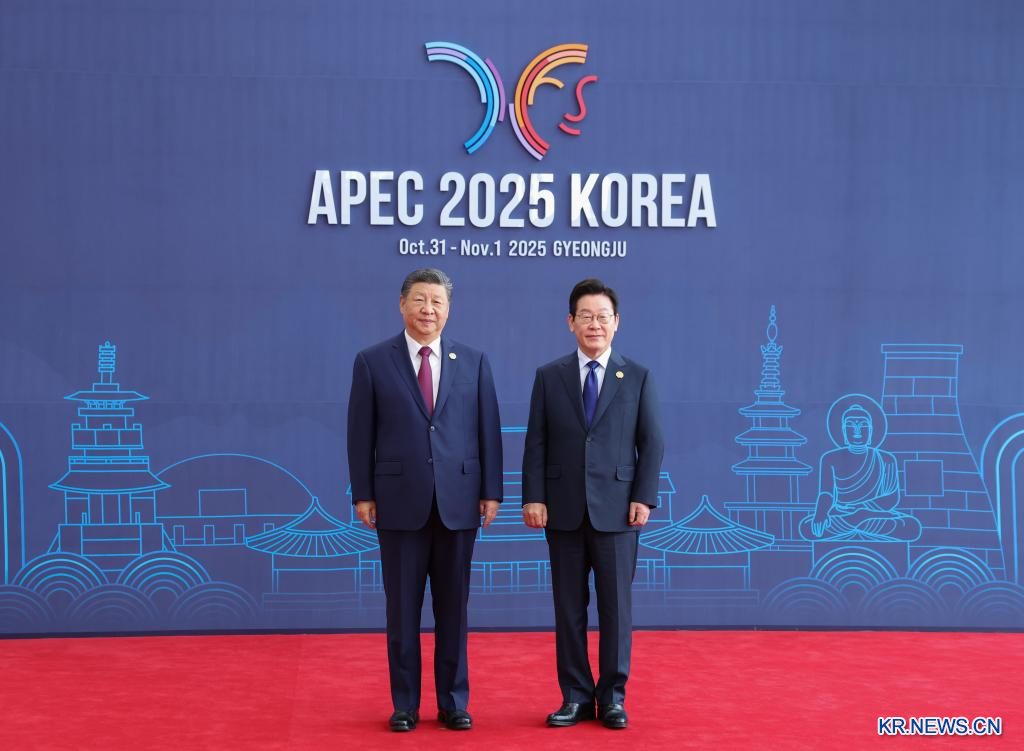 31일 오전 "제32차 아시아태평양경제협력체(APEC) 경제체 지도자회의" 제1세션이 경주 화백컨벤션센터에서 열렸다. 시진핑(習近平) 중국 국가주석은 회의에 참석해 "보혜·포용의 개방형 아시아태평양 경제를 공동 건설하자"는 주제의 중요 연설을 발표했다. 시 주석이 회의장에 도착했을 때 이재명 한국 대통령이 나와 따뜻하게 맞이했다.[촬영/신화사 기자 황징원(黄敬文)]
