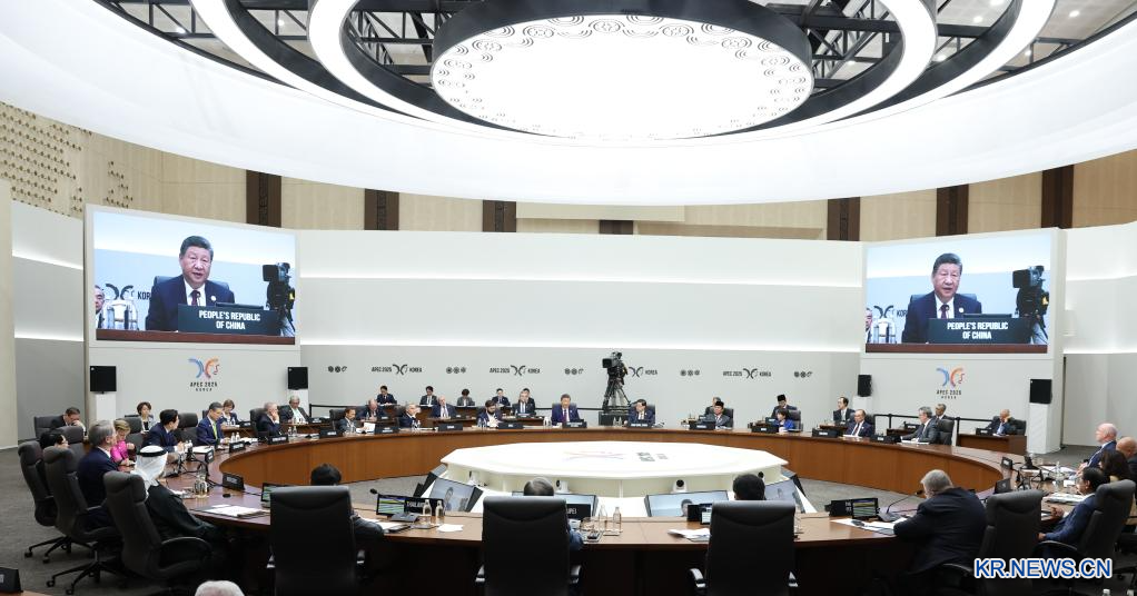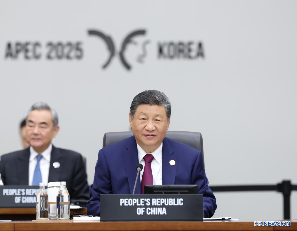 31일 오전 "제32차 아시아태평양경제협력체(APEC) 경제체 지도자회의" 제1세션이 경주 화백컨벤션센터에서 열렸다. 시진핑(習近平) 중국 국가주석은 회의에 참석해 "보혜·포용의 개방형 아시아태평양 경제를 공동 건설하자"는 주제의 중요 연설을 발표했다.[촬영/신화사 기자 황징원(黄敬文)]