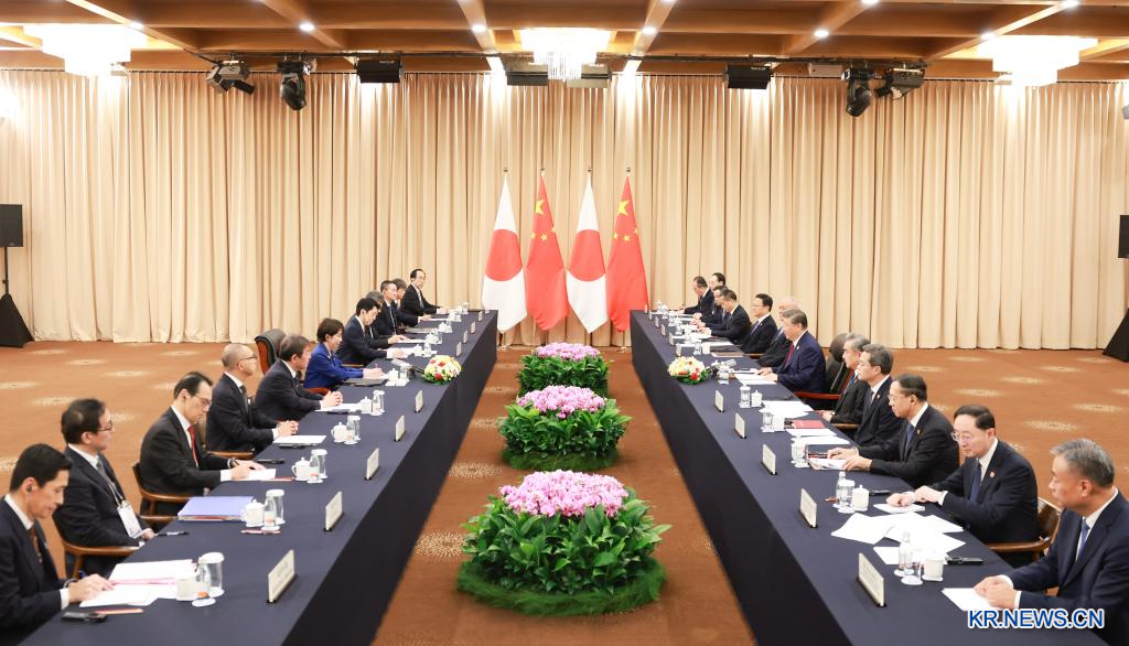[신화망 경주 11월1일] 31일 오후 시진핑(習近平) 중국 국가주석이 경주에서 열린 "제32차 아시아태평양경제협력체(APEC) 경제체 지도자회의" 기간 다카이치 사나에 일본 총리와 회견했다.[촬영/신화사 기자 딩린(丁林)]