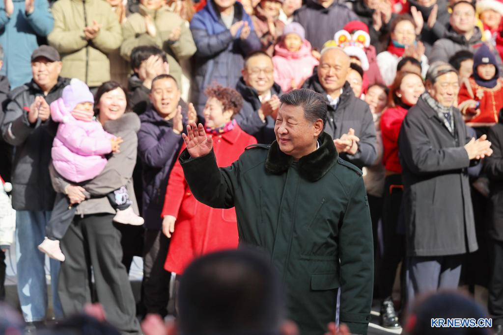 시진핑 주석이 10일 오전 둥청(東城)구 룽푸쓰(隆福寺) 거리를 방문해 현장 시민들에게 손을 흔들어 인사하고 있다.2026.2.10