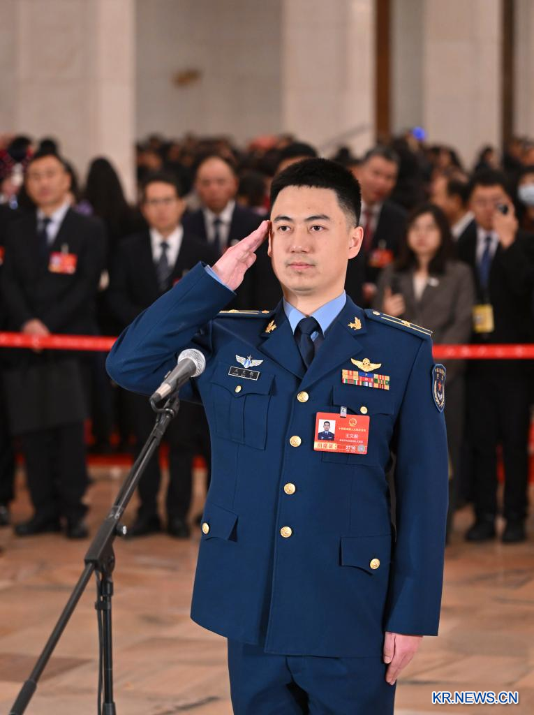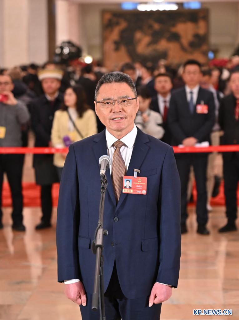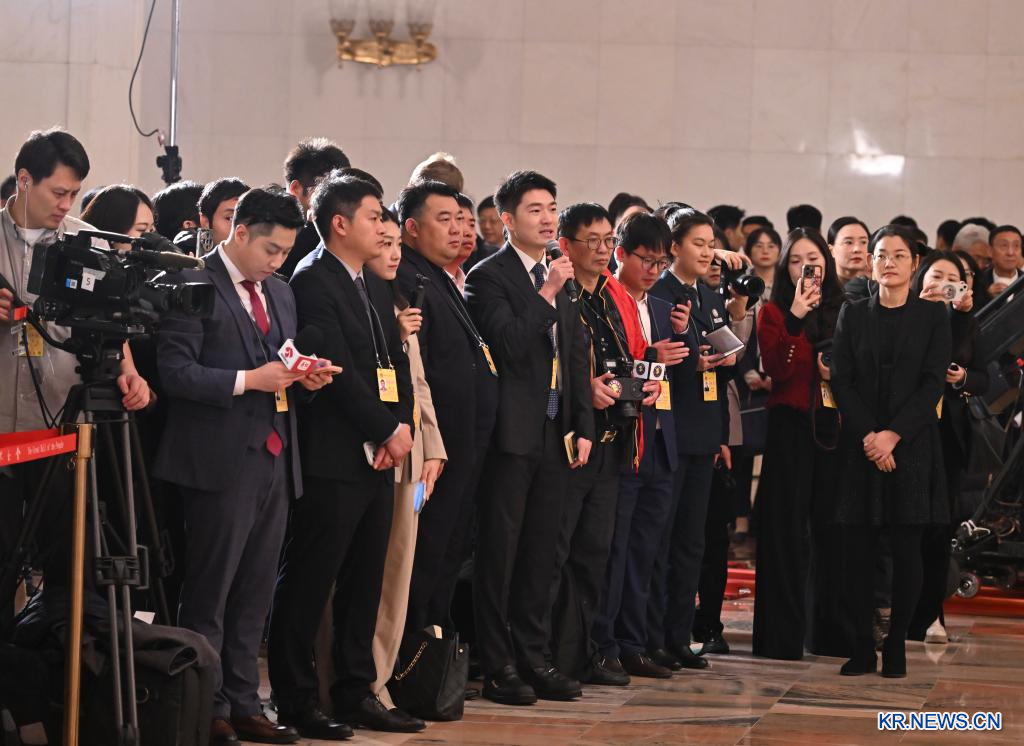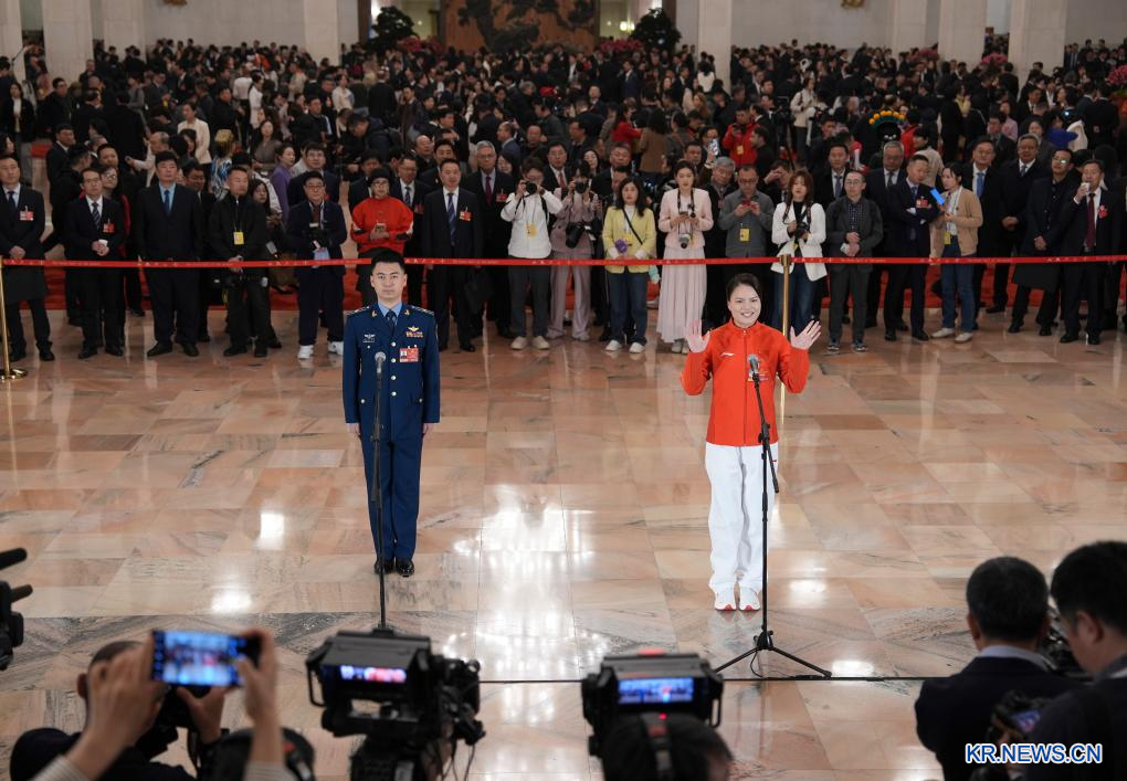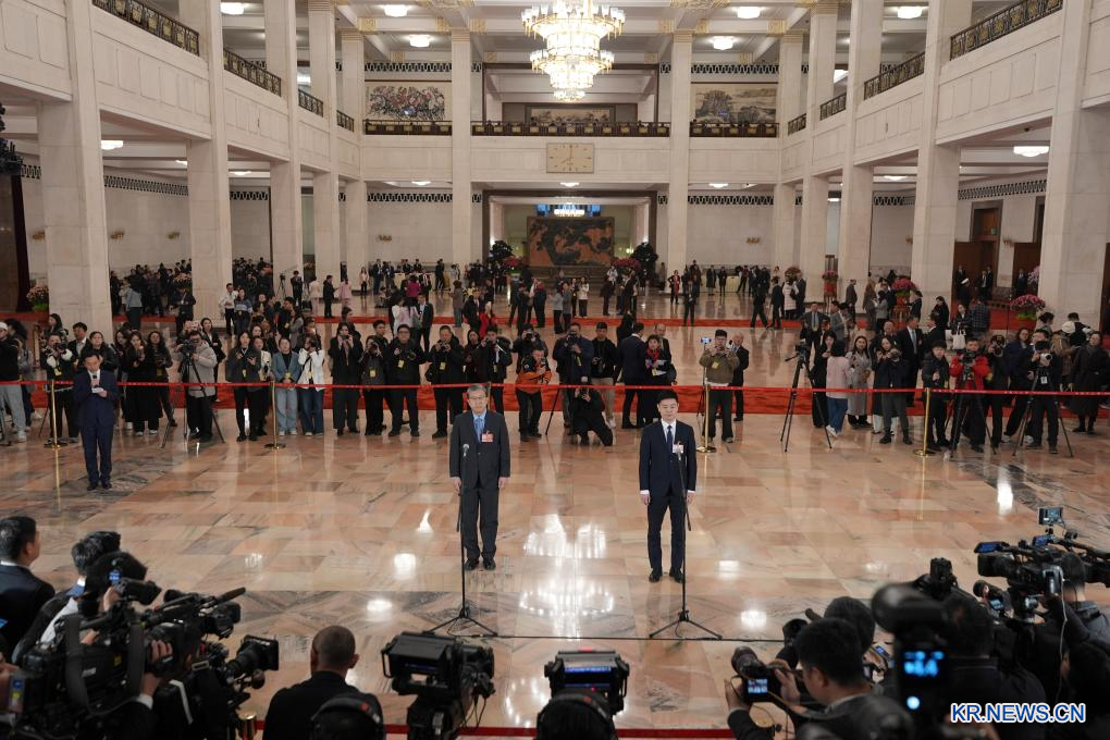 제14기 전국인민대표대회(전인대) 제4차 회의 첫 번째 "대표통로(代表通道)" 집중 취재 활동이 5일 베이징 인민대회당에서 열렸다. [촬영/신화통신 기자 리신(李鑫)]