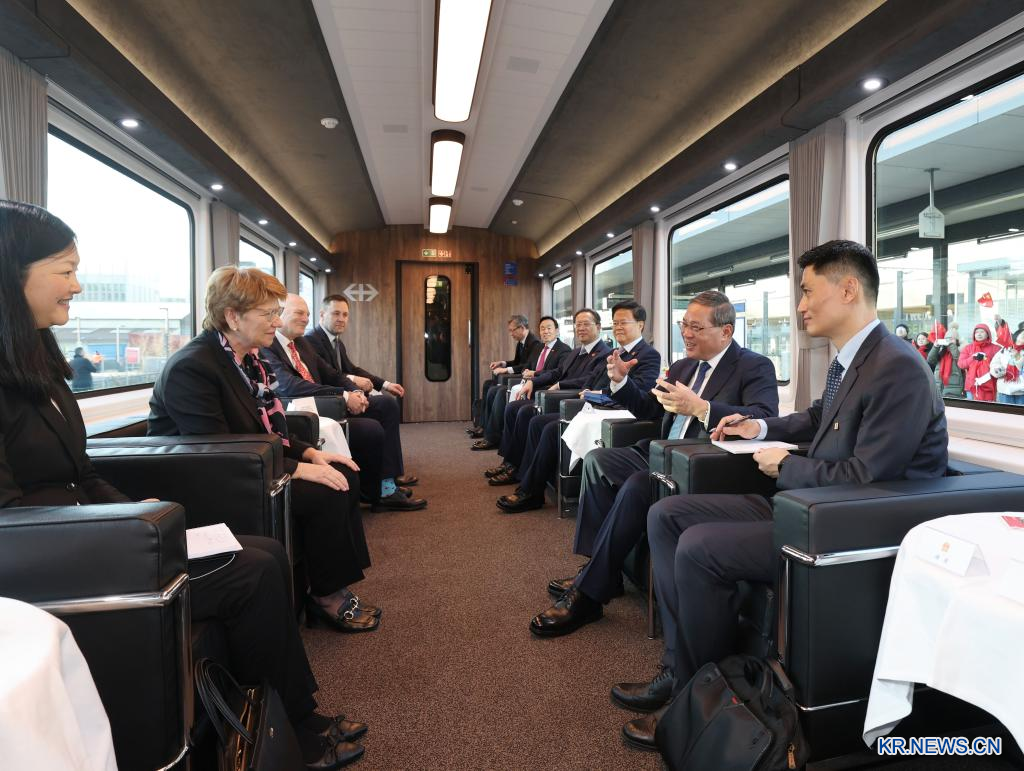 [신화망 베른 1월15일]리창(李强) 중국 총리와 비올라 암헤르트 스위스 연방 대통령이 14일 오후(현지시간) 취리히에서 전용열차를 타고 스위스 수도 베른으로 가면서 편안하고 우호적인 분위기에서 진솔한 대화를 나누고 있다.[촬영/신화사 기자 왕예(王曄)]