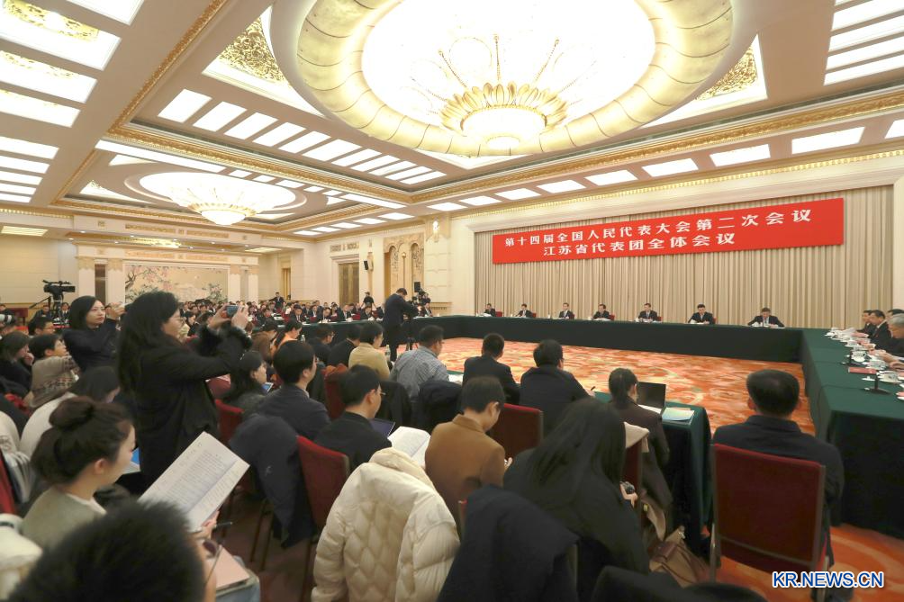 [신화망 베이징 3월8일] 제14기 전국인민대표대회(전인대) 제2차 회의 장쑤(江蘇) 대표단이 7일 대표단 소조회의를 열었다.[촬영/신화사 기자 루예(盧燁)]