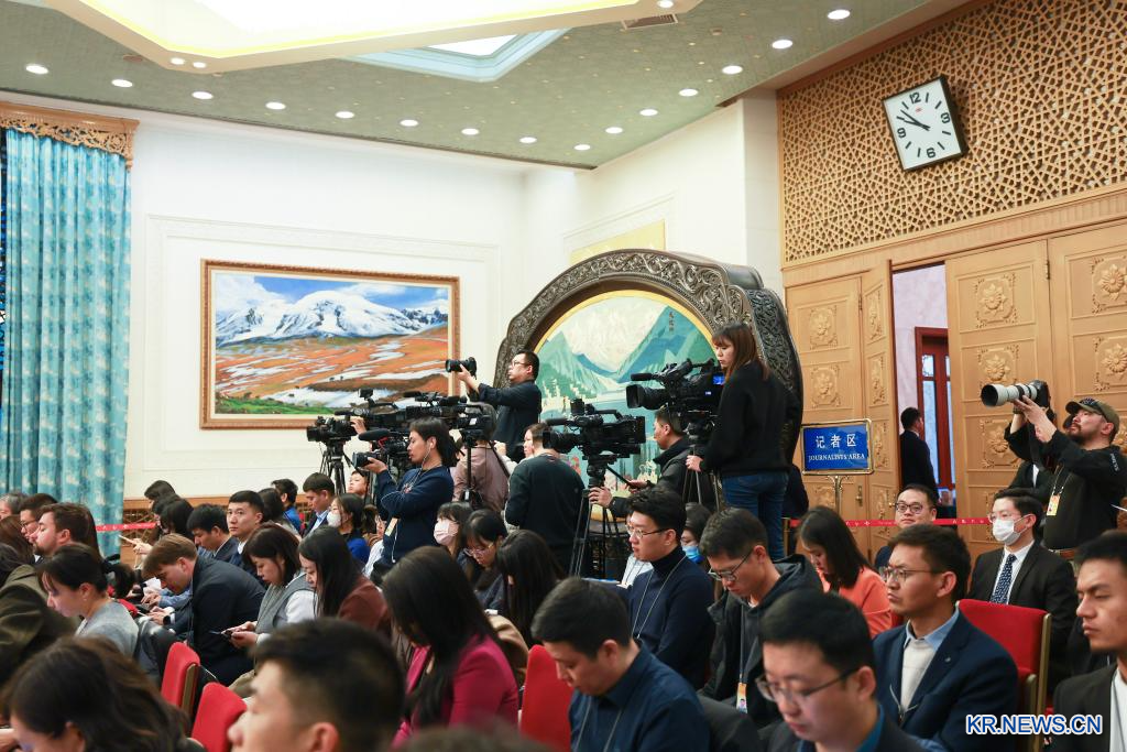 제14기 전국인민대표대회(전인대) 제2차 회의 신장 대표단이 7일 대표단 소조회의를 열었다. 사진은 회의 현장에서 취재 중인 기자들. [촬영/신화사 기자 왕징창(王婧嬙)]