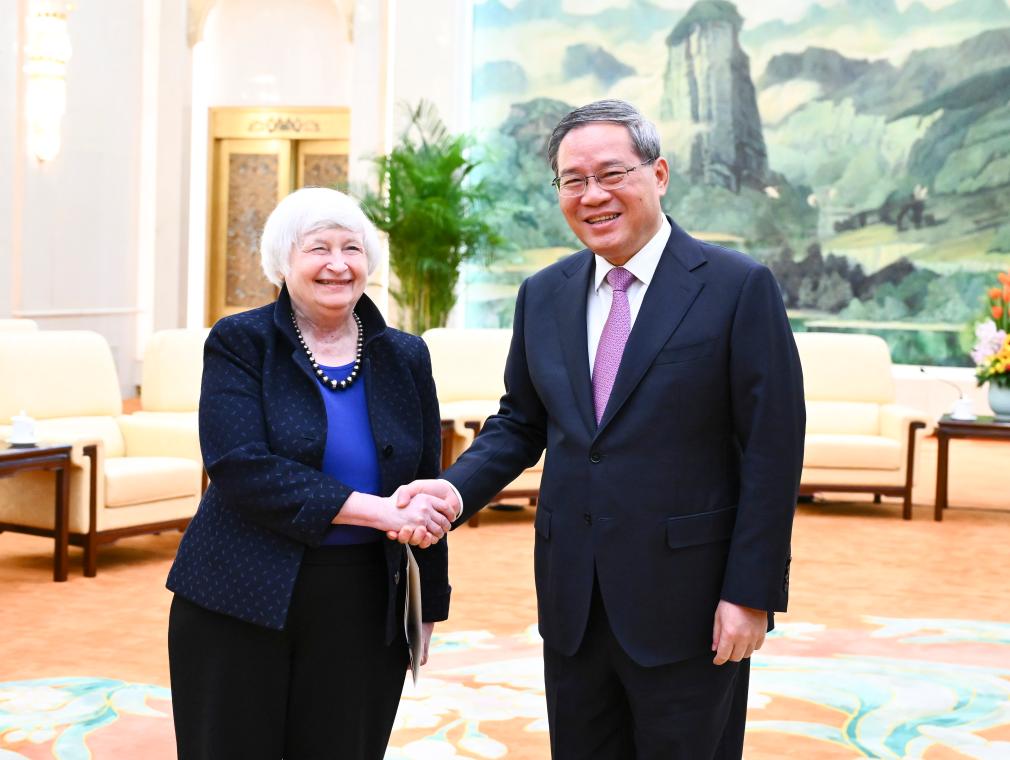 [신화망 베이징 4월8일]리창(李强) 중국 국무원 총리가 7일 오전 베이징 인민대회당에서 재닛 옐런 미국 재무장관을 접견했다.[촬영/신화사 기자 옌옌(燕雁)]