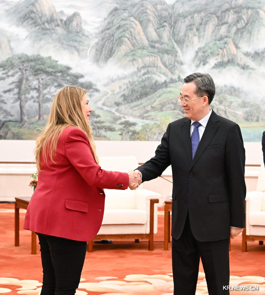 [신화망 베이징 4월16일]딩쉐샹(丁薛祥) 중국 공산당 중앙정치국 상무위원, 국무원 부총리가 15일 베이징에서 캐시 비달 미국 특허상표청장을 접견했다.[촬영/신화사 기자 선훙(申宏)]