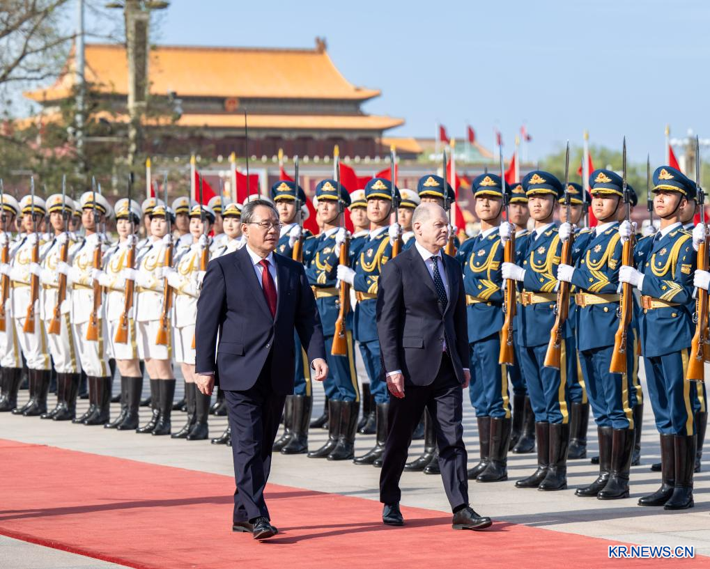 [신화망 베이징 4월17일] 리창(李强) 중국 국무원 총리가 16일 오후 베이징 인민대회당에서 중국을 공식 방문한 올라프 숄츠 독일 총리와 회담을 가졌다.회담에 앞서 리 총리는 인민대회당 동문 밖 광장에서 숄츠 총리를 위해 환영식을 열었다.[촬영/신화사 기자 자이젠란(翟健嵐)]