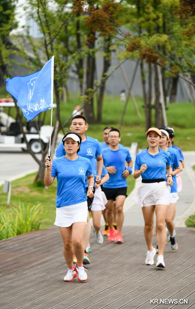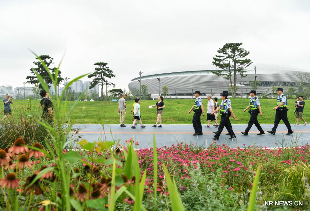 청두시 룽취안이구 둥안후 체육공원에서 두이핑(앞줄 오른쪽 4번째) 파출소장이 경찰들을 인솔해 순찰을 돌고 있다.2023.7.12.