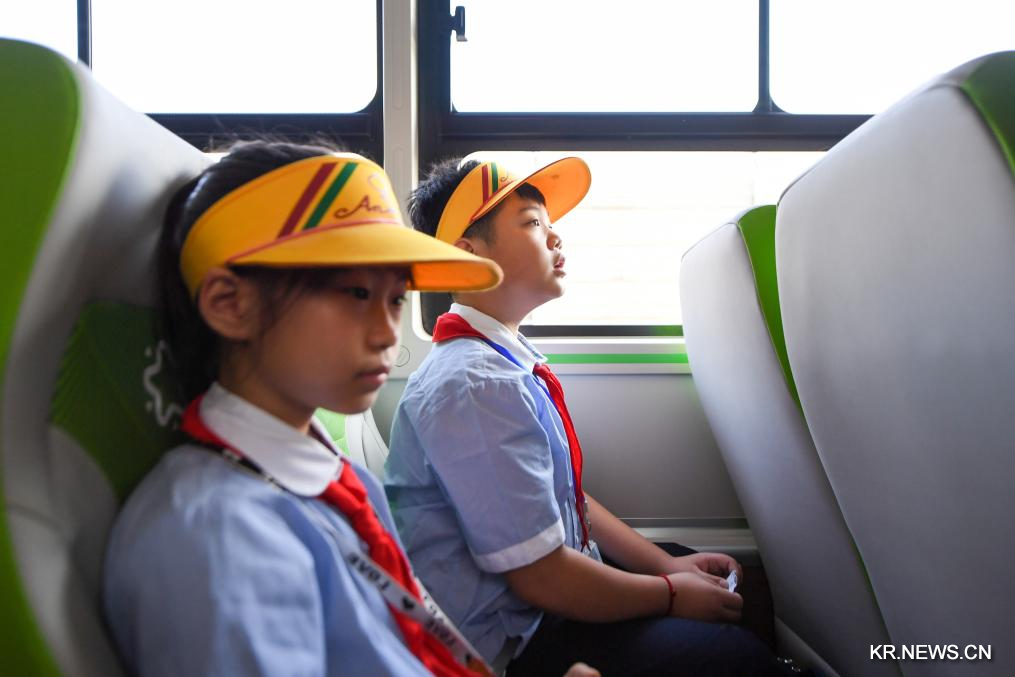 [신화망 베이징 9월2일]베이징시 펑타이(豐台)구 제1초등학교 학생 2명이 1일 스쿨버스를 타고 등교하고 있다.