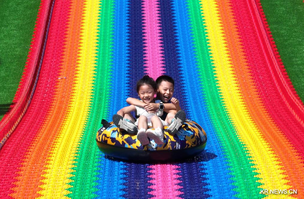 장쑤(江蘇)성 양저우(揚州)시 주위완(茱萸湾) 풍경구를 찾은 아이들이 무지개 미끄럼틀을 타고 내려오는 모습을 4일 드론으로 담았다. 2023.10.4