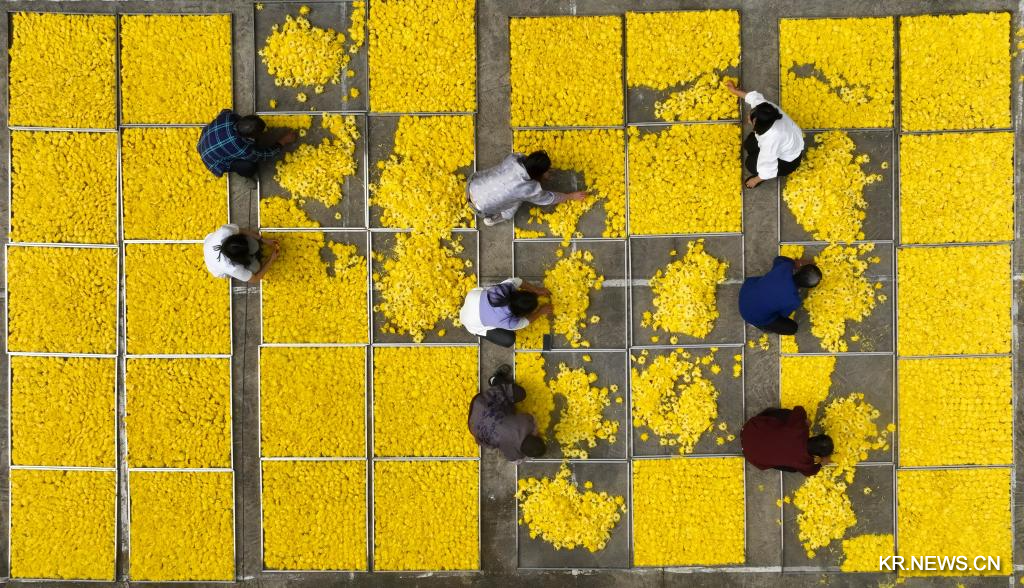 [신화망 헝양 11월6일] 후난(湖南)성 헝양(衡陽)시 웨린(岳林)촌 황국(皇菊)재배기지가 수확철을 맞아 현지 주민들이 황국 수확∙가공 작업으로 분주한 나날을 보내고 있다. 최근 수년간 웨린촌은 경제적 가치가 큰 고산 황국을 재배하는 한편 농촌 관광 사업을 추진해 농민 소득 증대를 이끌고 있다.