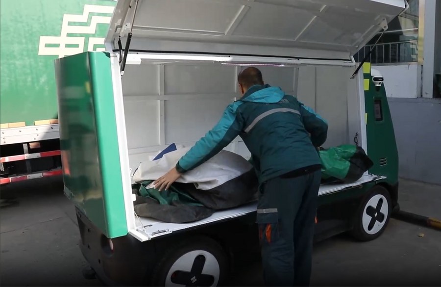 그런데 새 멤버가 합류하면서 더 이상 펑하이빈 혼자서 그 많은 택배 물량을 다 감당할 필요가 없게 됐다. L4급 자율주행 기술을 탑재한 무인택배차 덕분이다. 600㎏까지 적재 가능한 자율주행 무인택배차는 시속 15㎞로 달리며 하루 최대 약 800개 택배를 운송할 수 있다.