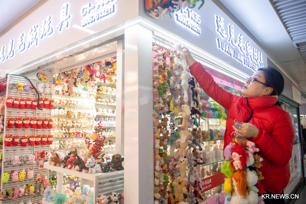 [신화망 이우 2월22일] 저장(浙江)성 이우(義烏)시 국제비즈니스타운의 한 운영자가 21일 매장에 샘플을 진열하고 있다.