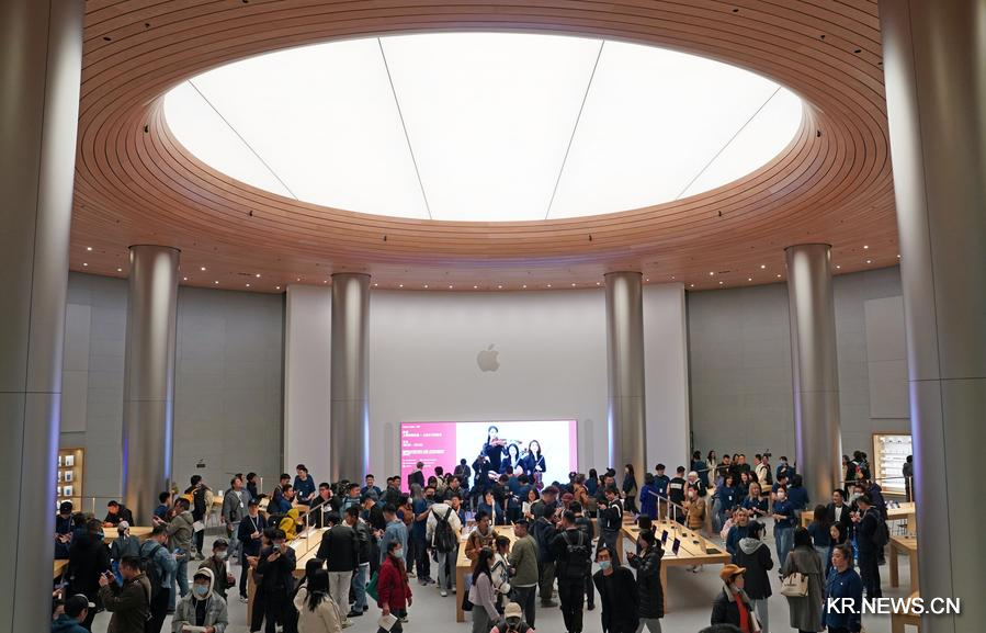 [신화망 상하이 3월26일] 중국 본토 최대 애플스토어가 지난 21일 저녁 상하이에서 문을 열었다. 이날 팀 쿡 애플 최고경영자(CEO)가 문을 열고 중국 소비자들을 맞이했다.
