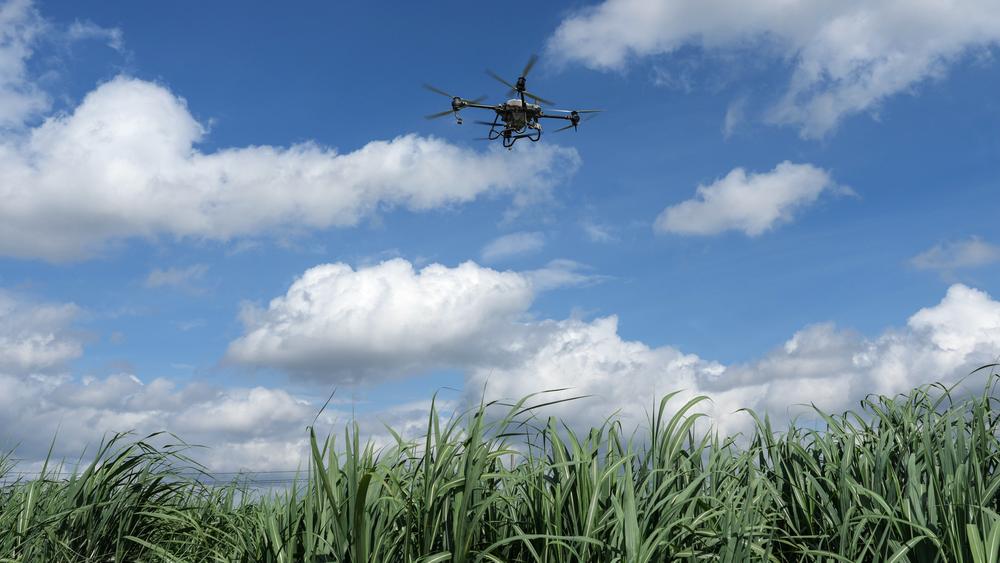 17일 난닝(南寧)시 우밍(武鳴)구의 한 사탕수수밭에서 물과 비료를 살포하는 드론. 2024.7.17