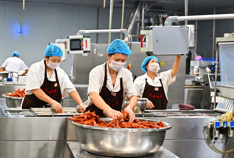 [신화망 청두 9월21일] 중추절이 지나고 국경절이 다가오면서 쓰촨(四川)성 메이산(眉山)시 런서우(仁壽)현의 촨루샹반(川鹵相伴)식품회사는 성수기를 맞았다. 회사 직원인 랴오원자오(廖文嬌·35)가 생산 작업장에서 제품을 포장하고 있다.