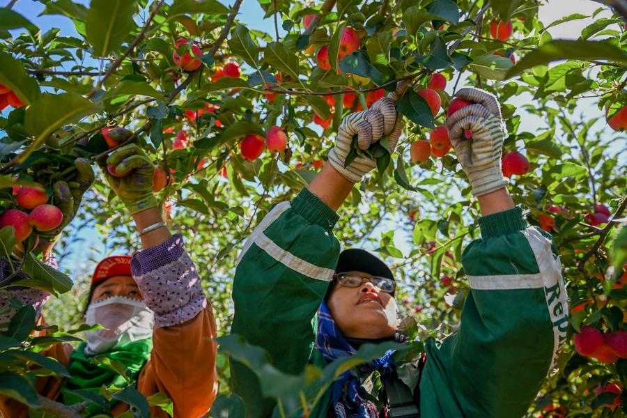 [신화망 후허하오터 9월21일] 수확의 계절 가을날 네이멍구(內蒙古)자치구 커얼친(科爾沁) 사막 지역에서 재배되고 있는 금수해당 열매가 탐스럽게 익었다. 대형 콜드체인 트럭이 줄줄이 들어와 금수해당 열매를 싣는다. 이 열매는 광둥(廣東)성 선전(深圳), 랴오닝(遼寧)성 다롄(大連)의 항구로 운송된 후 말레이시아, 태국 등 국가로 수출된다.