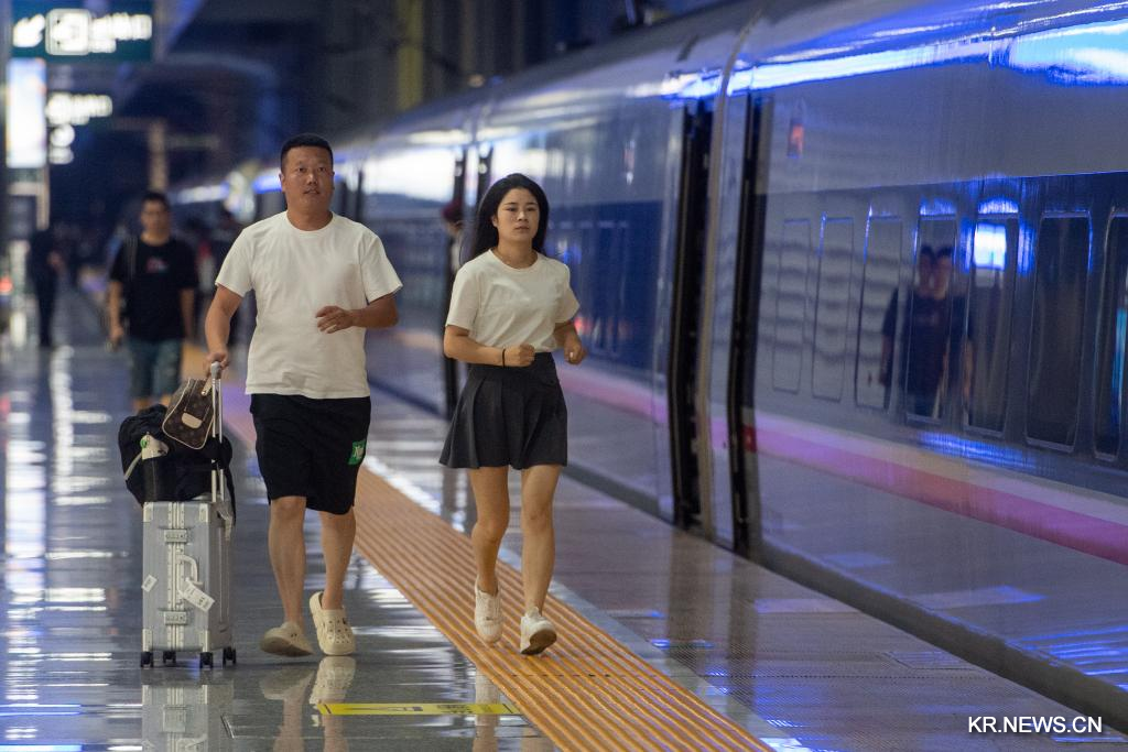 [신화망 충칭 8월4일] 3일 충칭(重慶)시 사핑바(沙坪壩)역 승강장에서 열차 탑승을 준비하고 있는 승객.