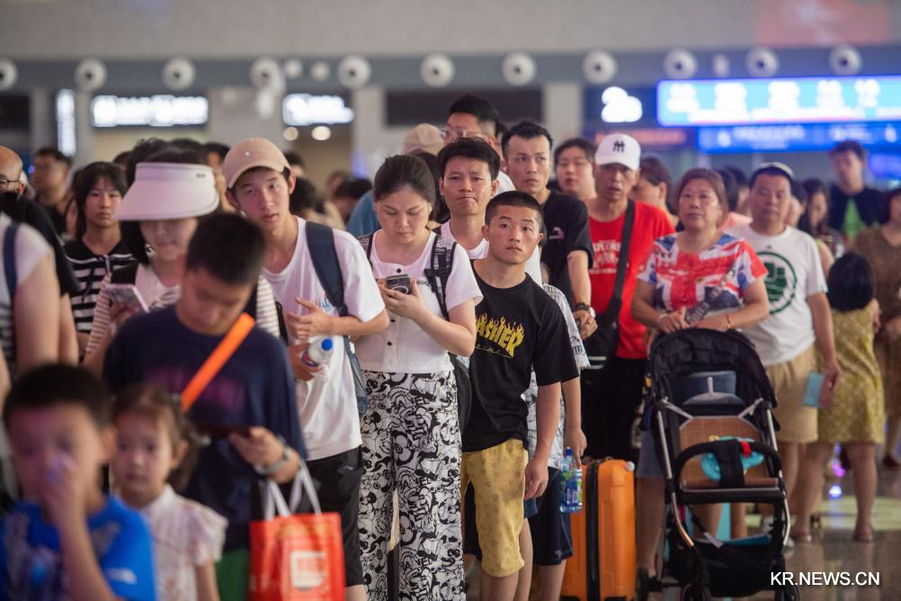 3일 충칭(重慶)시 사핑바(沙坪壩)역 여객터미널에서 검표를 기다리고 있는 여행객들. 2023.8.3
