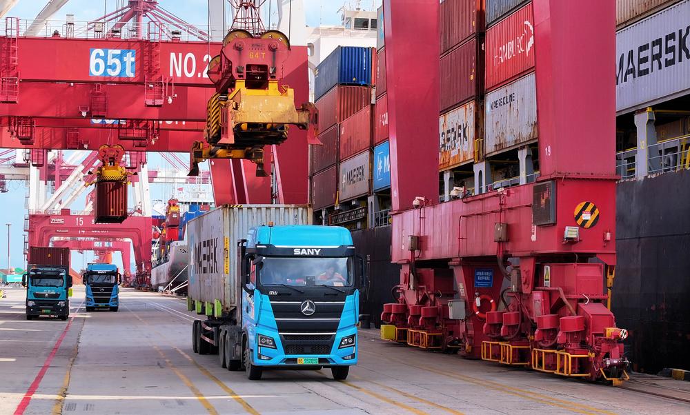 29일 산둥(山東)성 칭다오(青島)항 첸완(前灣) 항구구역에서 크레인이 트럭에 컨테이너를 싣고 있다.