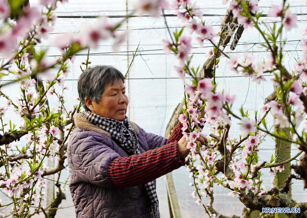 [신화망 중국 스자좡 2월 6일] 4일 허베이(河北)성 탕산(唐山)시 하이강(海港)경제개발구에 위치한 왕탄(王灘)진의 한 농민이 비닐하우스에서 복숭아꽃을 솎아내고 있다.