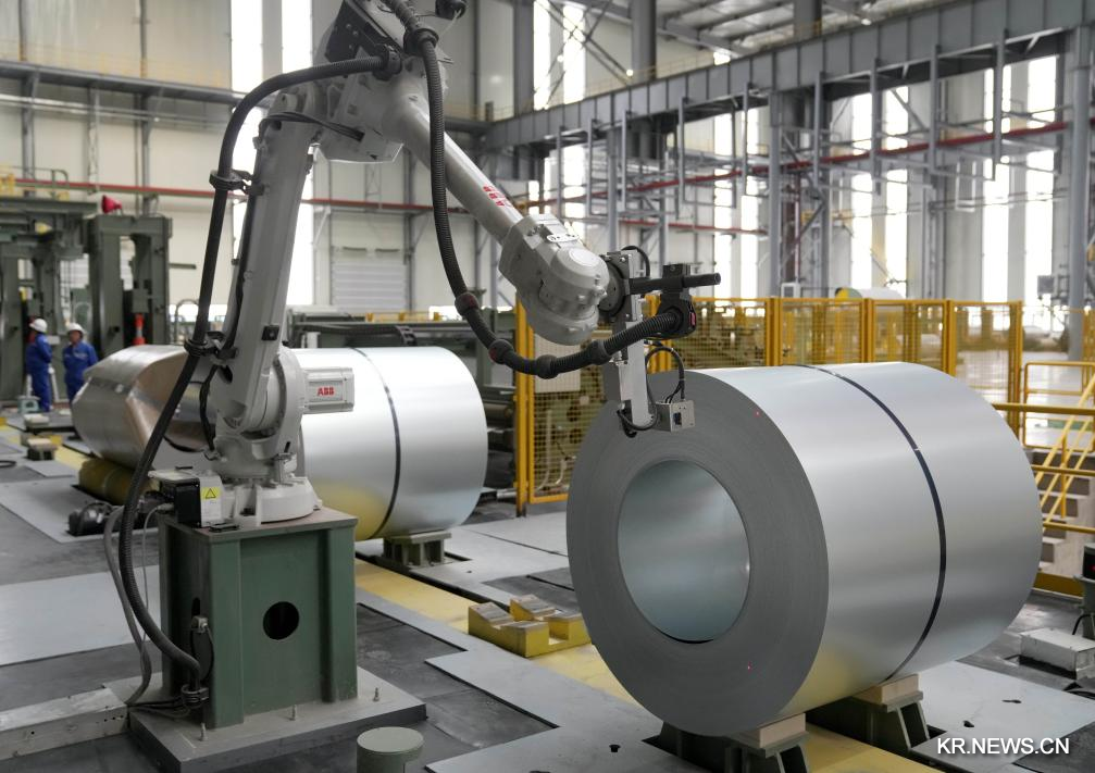 [신화망 탕산 10월20일] 19일 허강(河鋼)-포항 자동차강판 합자프로젝트 생산라인의 로봇이 완성품에 제품코드를 찍고 있다.