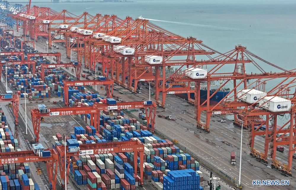 [신화망 중국 친저우 3월5일] 광시(廣西)좡족자치구 베이부완(北部灣)항 친저우(欽州) 항구에서는 부두 크레인, 갠트리 크레인 등 자동화 장비가 가동되고 차량들이 오가면서 화물 운송 작업으로 분주한 모습이 연출되고 있다.