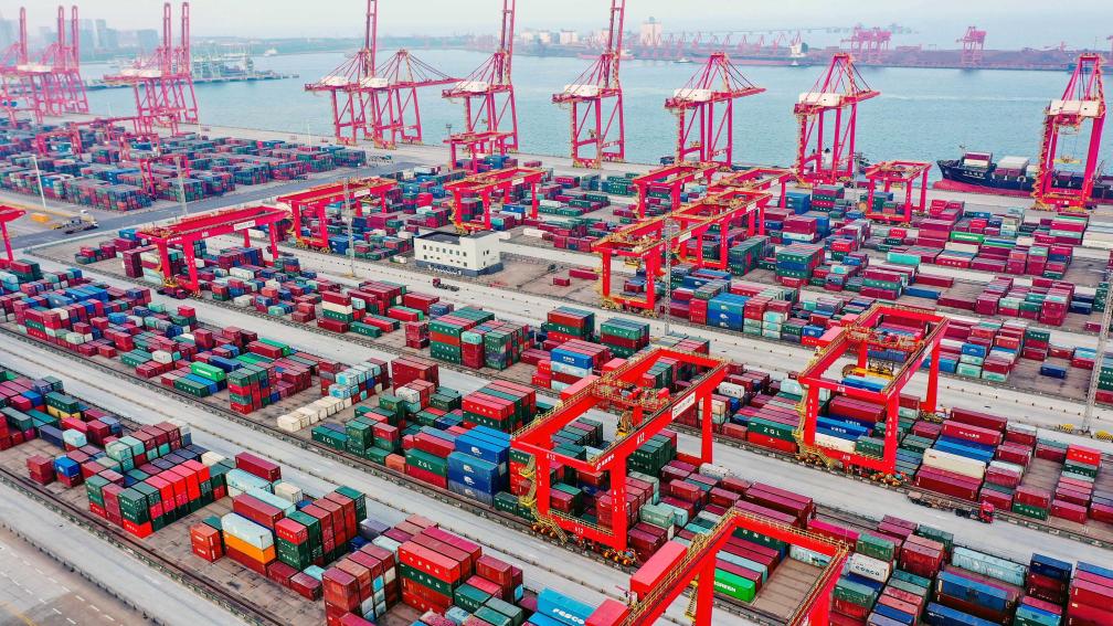 23일 드론으로 내려다본 산둥항구 르자오항 컨테이너 부두 모습. 2023.10.24